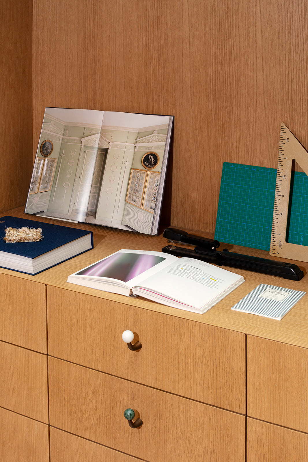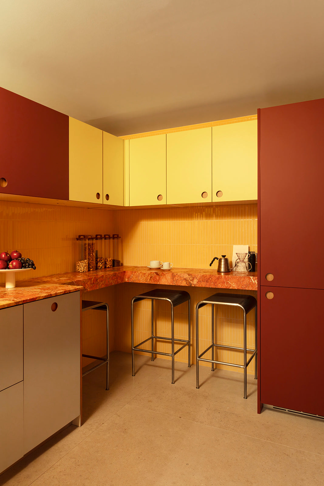 • En muchos proyectos, la cocina se plantea desde el producto. Aquí el punto de partida fue otro: cómo se utiliza el espacio a diario. El estudio recibe colaboradores, se revisan materiales, se mantienen reuniones informales y, al mismo tiempo. La circulación debía ser clara. El almacenamiento, lógico. Las proporciones, coherentes con el resto de la arquitectura.