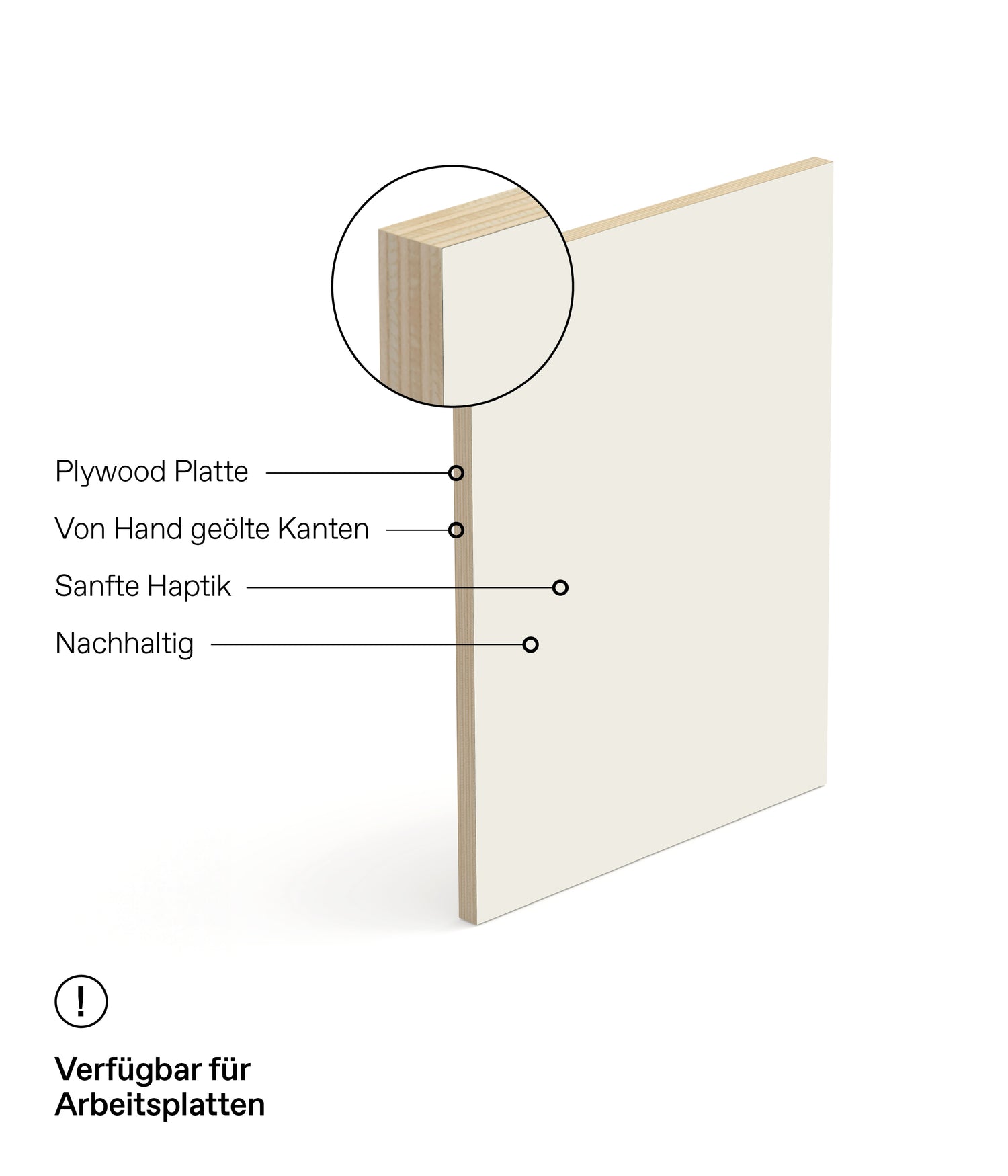 Dieses aus Korkpulver, Nadelharz und Leinöl hergestellte Material bietet eine einzigartige Haptik und eine warme, natürliche Ausstrahlung. Die Oberfläche ist auf Birkensperrholzplatten laminiert und vereint Nachhaltigkeit, Beständigkeit und Design.