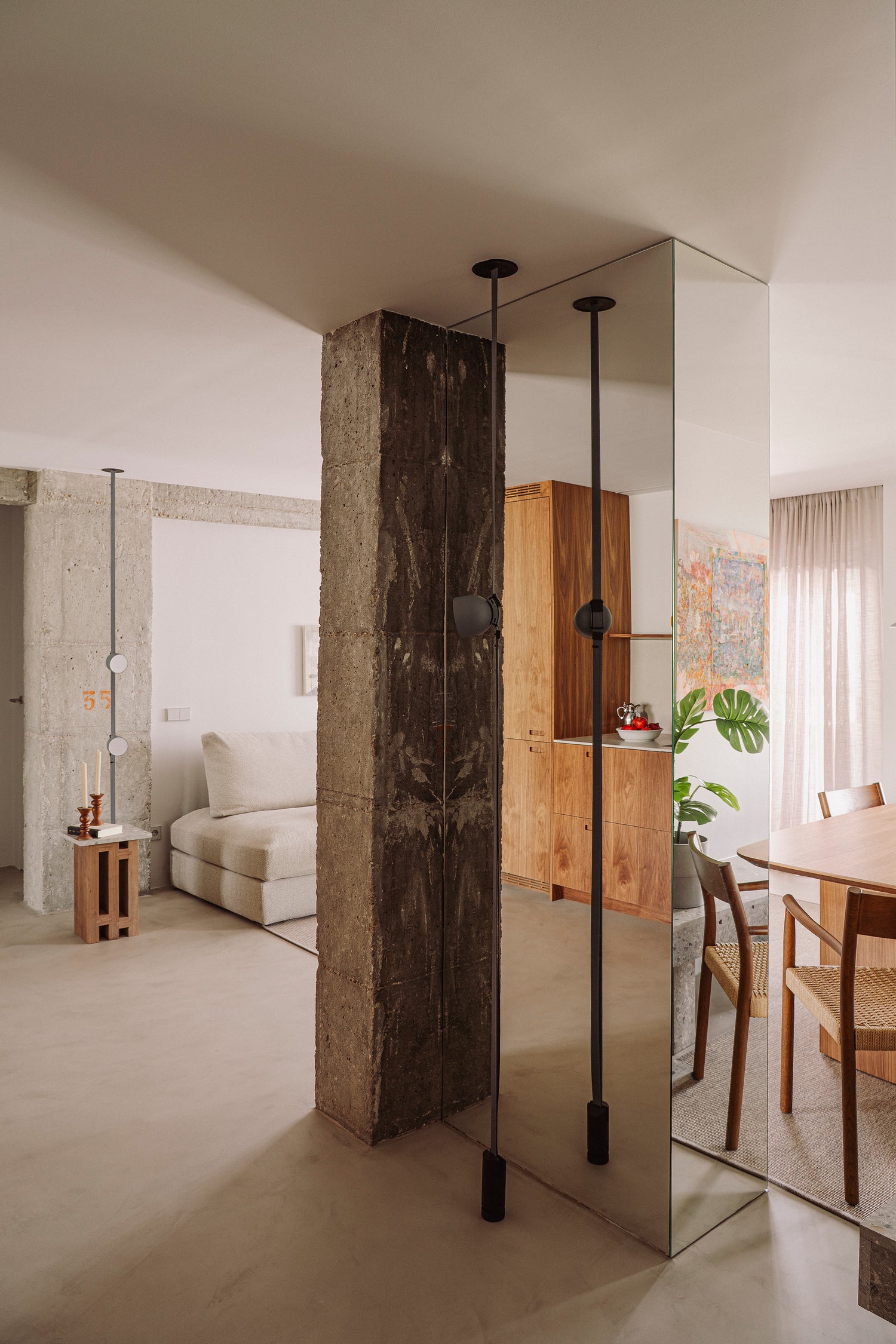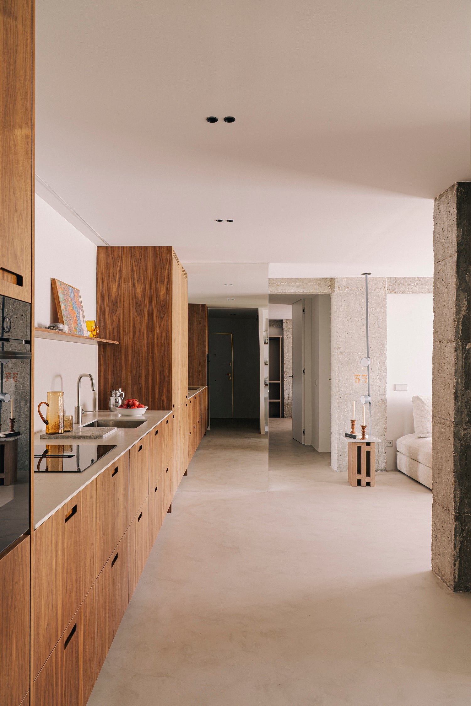 La reforma partió de esa condición. Se abrió la planta, se tiraron los tabiques que sobraban, y el espacio empezó a respirar. Lo que quedó fue un interior amplio, tranquilo, construido con pocos materiales pero elegidos con mucho criterio.
