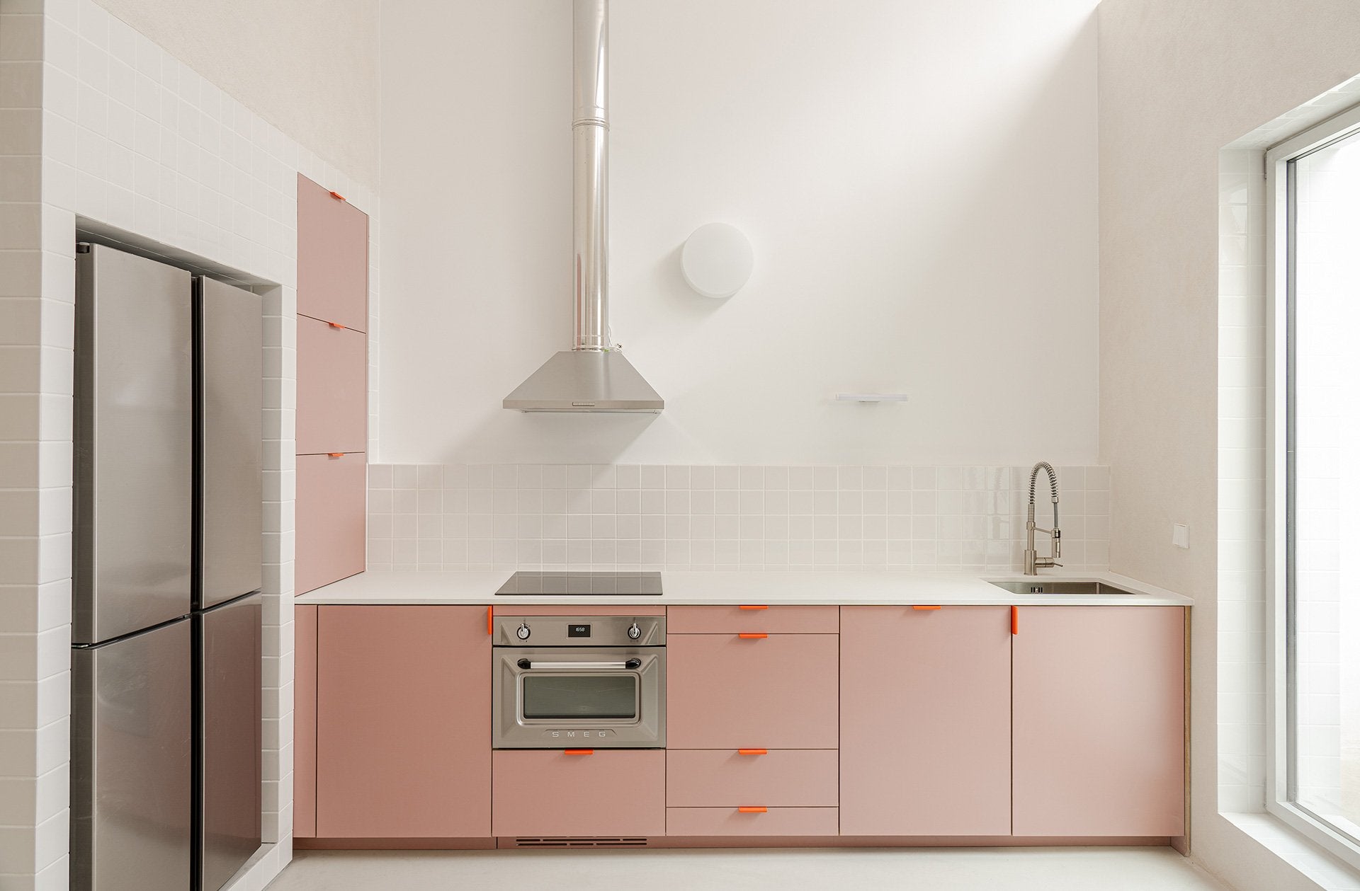 En la cocina, se ha seleccionado un acabado en LAMINADO Blush, que contrasta el color con los blancos que predominan en el resto de la casa. La paleta de colores suaves, complementada por los tiradores en tonos naranja brillante, aporta vivacidad y crea un ambiente estimulante a través del color.