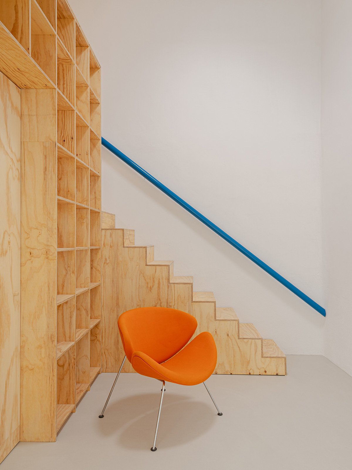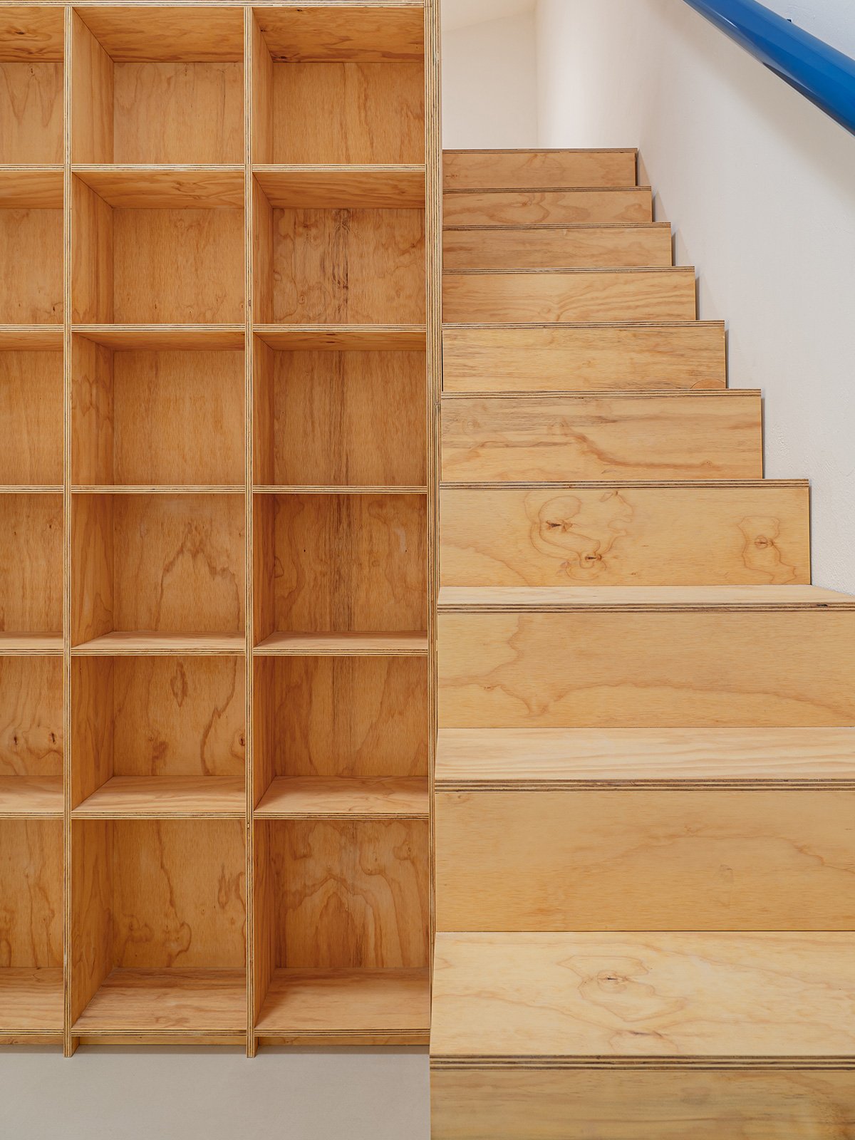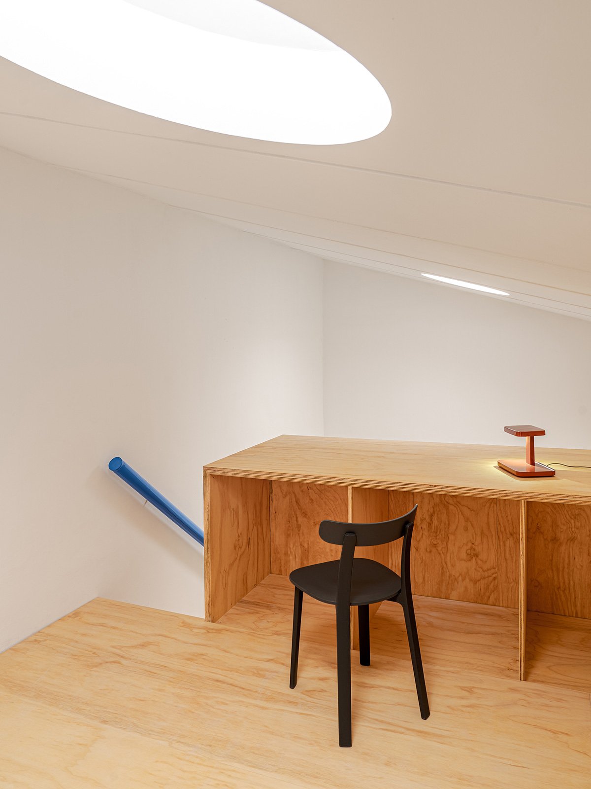 Para las áreas de descanso se ha diseñado una estructura de madera independiente, como una pequeña casa dentro del espacio, que además sirve a otras áreas como estantería para la biblioteca, mesa para el estudio y armario. De esta manera, esta estructura no solo sirve para crear espacios íntimos, sino que también apoya a las otras áreas alrededor con mobiliario integrado y práctico.